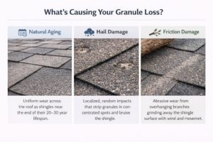 Understanding what caused the granule loss on your roof is key to determining the right response. Natural aging is the most common factor. As shingles approach the end of their 20 to 30-year lifespan, the bond securing the granules weakens and shedding accelerates. This is an expected sign that a roof replacement is on the horizon, not that something has gone wrong.